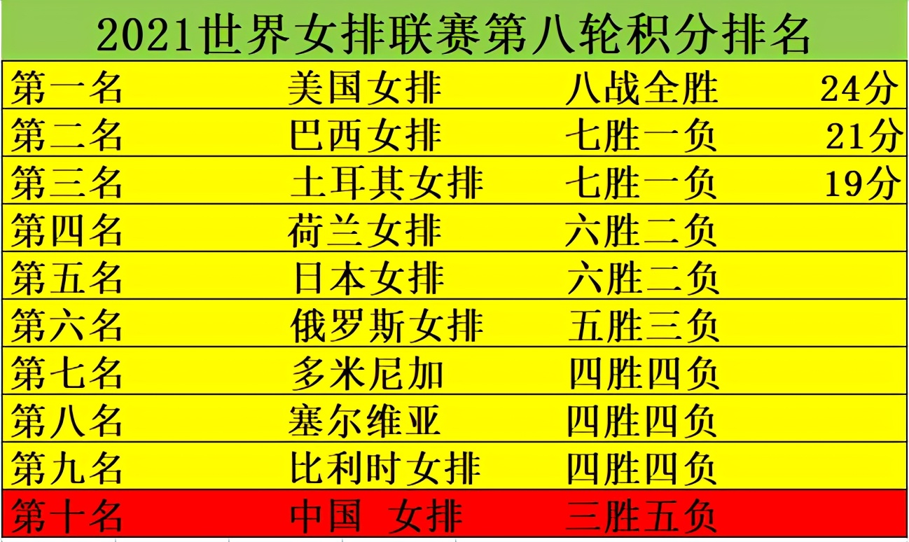 Jun 15, 2021 · 北京时间6月15日,世界女排联赛预赛第12轮结束,中国女排战胜意大利之后,积分涨6分,以353分列第三,与巴西的差距缩小到5分。美国女排12连胜. Jun 08, 2021 · 中国女排代理队长张常宁独得37分,是这一联赛创立以来第5高的单场个人得分。儘管如此,中国女排仍未能阻止比利时以17:25、27:25、23:25、25:21、15:8获胜。 中国女排在第一局赢得较为轻鬆,但场面自第2局开始陷入胶着。 Jun 14, 2021 · 积分榜上,11轮之后,中国女排目前是6胜5负,积18分,排名第8。 前7分别是美国队、巴西队、土耳其队、荷兰队、日本队、塞尔维亚队、多米尼加队。
